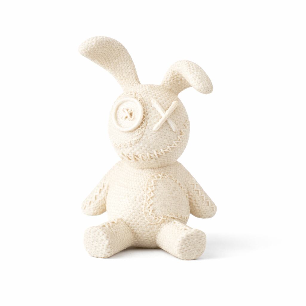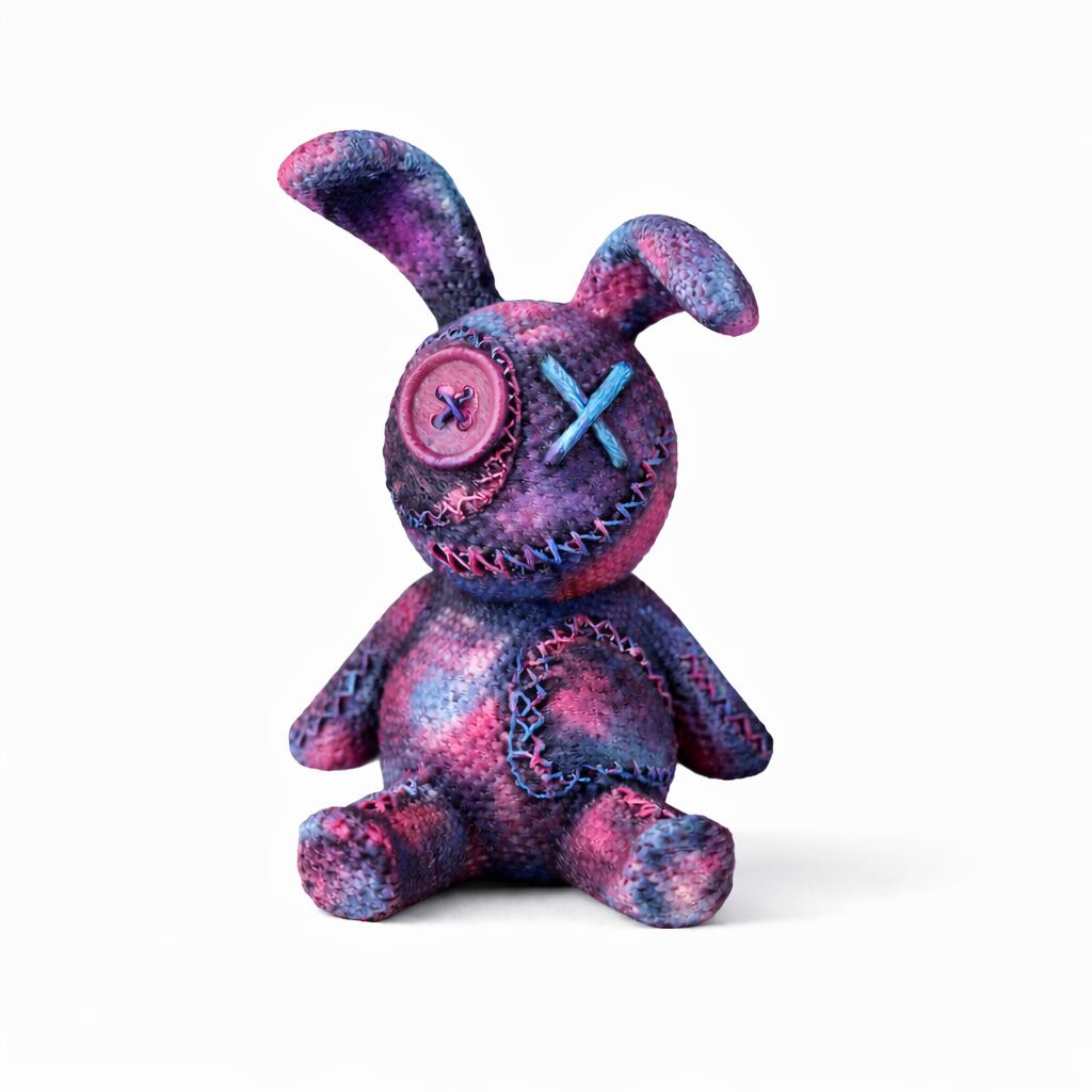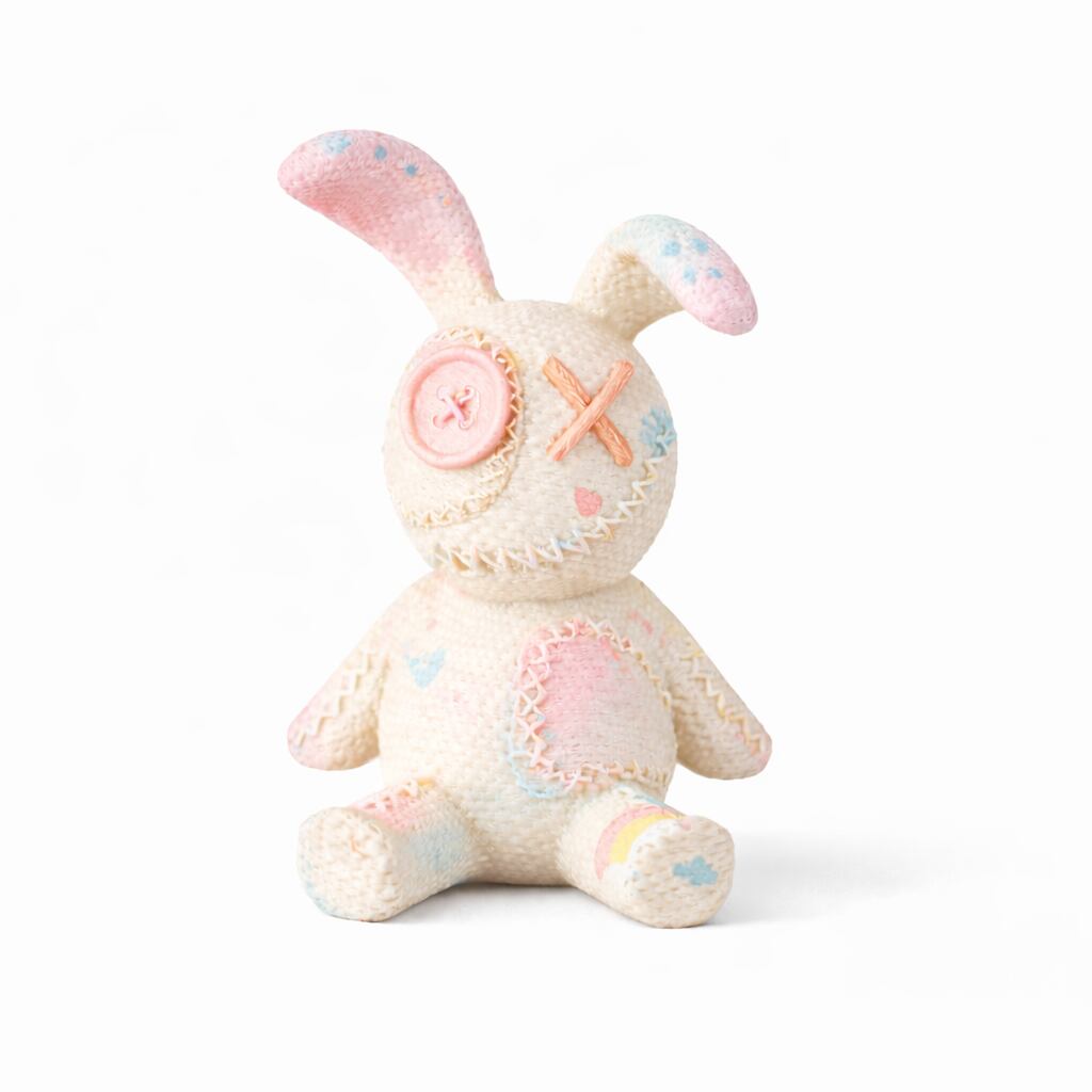 Soft, stitched, and 100% up to something. One ear up like it's listening, one ear down like it already knows too much. One button eye watching your every move, one stitched X… probably winking at forces beyond human comprehension.